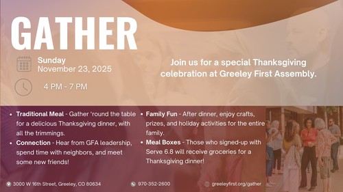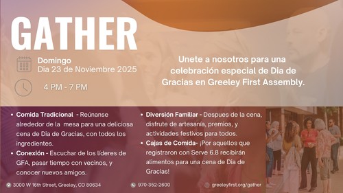 ¡Únase a nosotros el domingo 23 de noviembre a las 4 p. m. para una fiesta inolvidable! ¡Serviremos una deliciosa comida tradicional GRATIS, así como una variedad de juegos para jóvenes, niños y adultos! ¡Hay algo para todos en nuestro evento Gather!