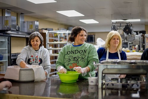 Our amazing kitchen crew cooks a different meal each week, complete with sides, drinks and a dessert. People start lining up about 5:45 PM. The meals vary between pasta, pulled-pork, tacos and more!